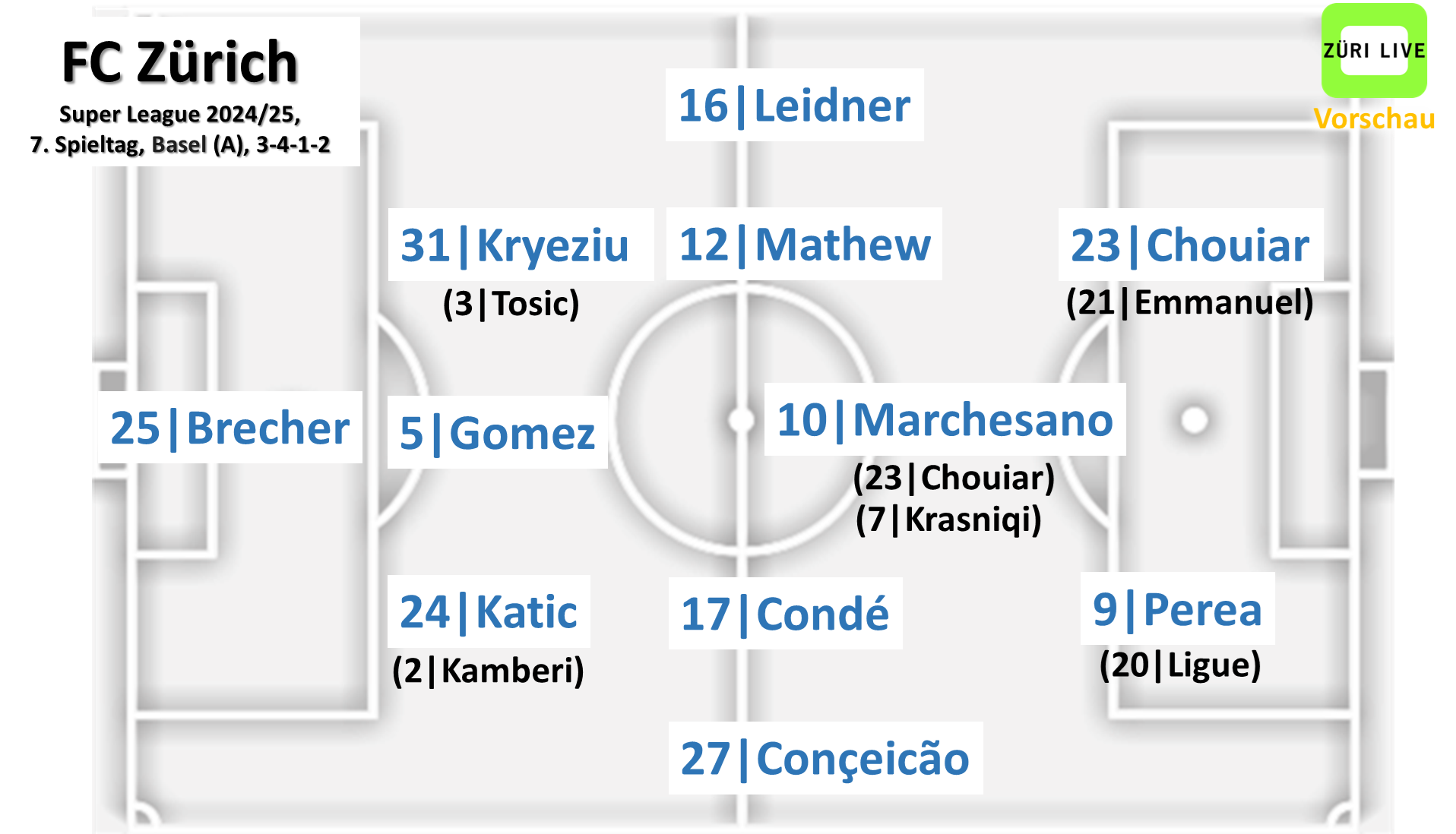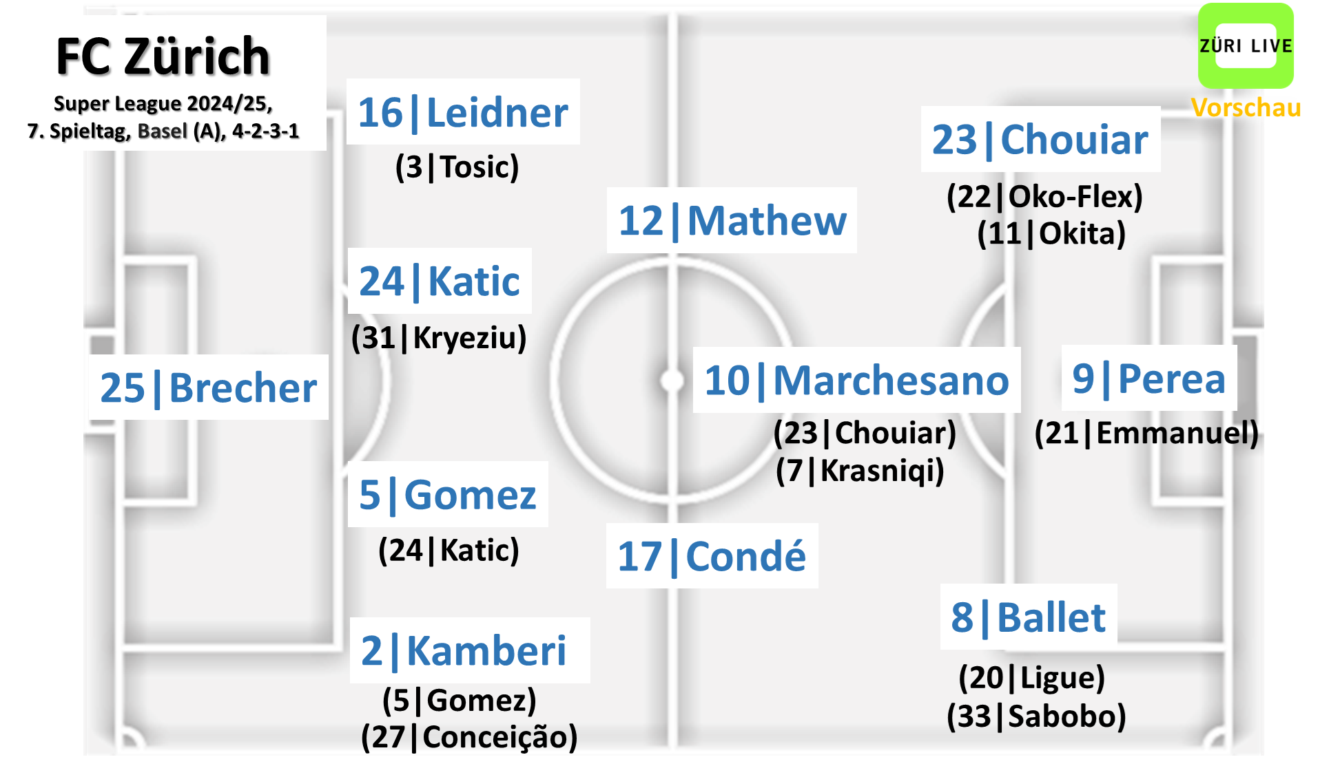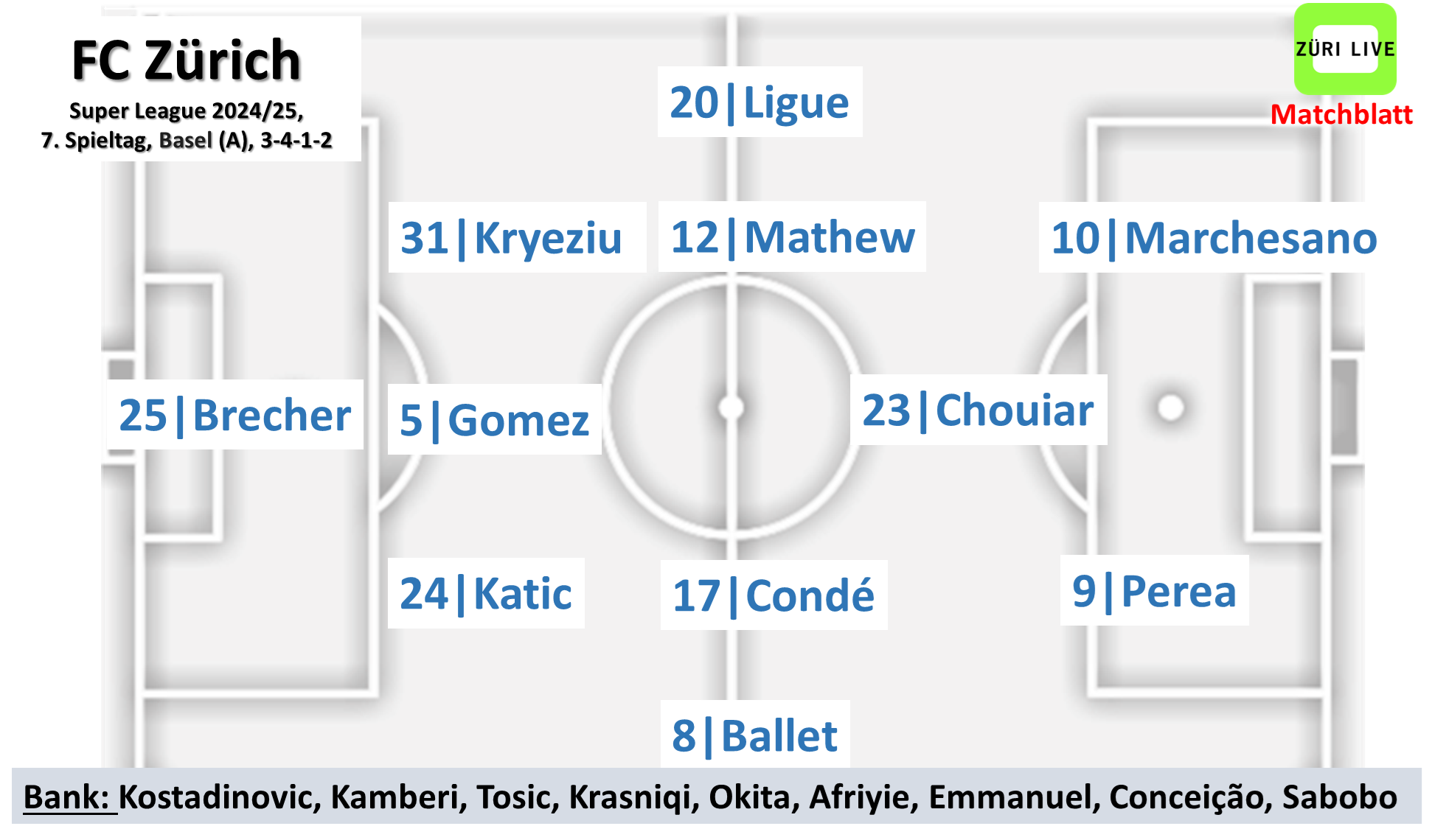 Wahrscheinlicher und passender zum Kader ist die von den holländischen Trainern favorisierte Viererabwehr. In diesem Fall wäre es durchaus denkbar, dass Samuel Ballet in seinem ersten Ligaspiel für den FCZ gleich in der Startaufstellung stehen wird. Neben Yanick Brecher sind Nikola Katic, Mariano Gomez, Cheick Condé (in Abwesenheit von Cheveyo Tsawa), Ifeanyi Mathew und Antonio Marchesano gesetzt. Auch mit den Startelfeinsätzen von Mounir Chouiar und Juan José Perea ist normalerweise zu rechnen.