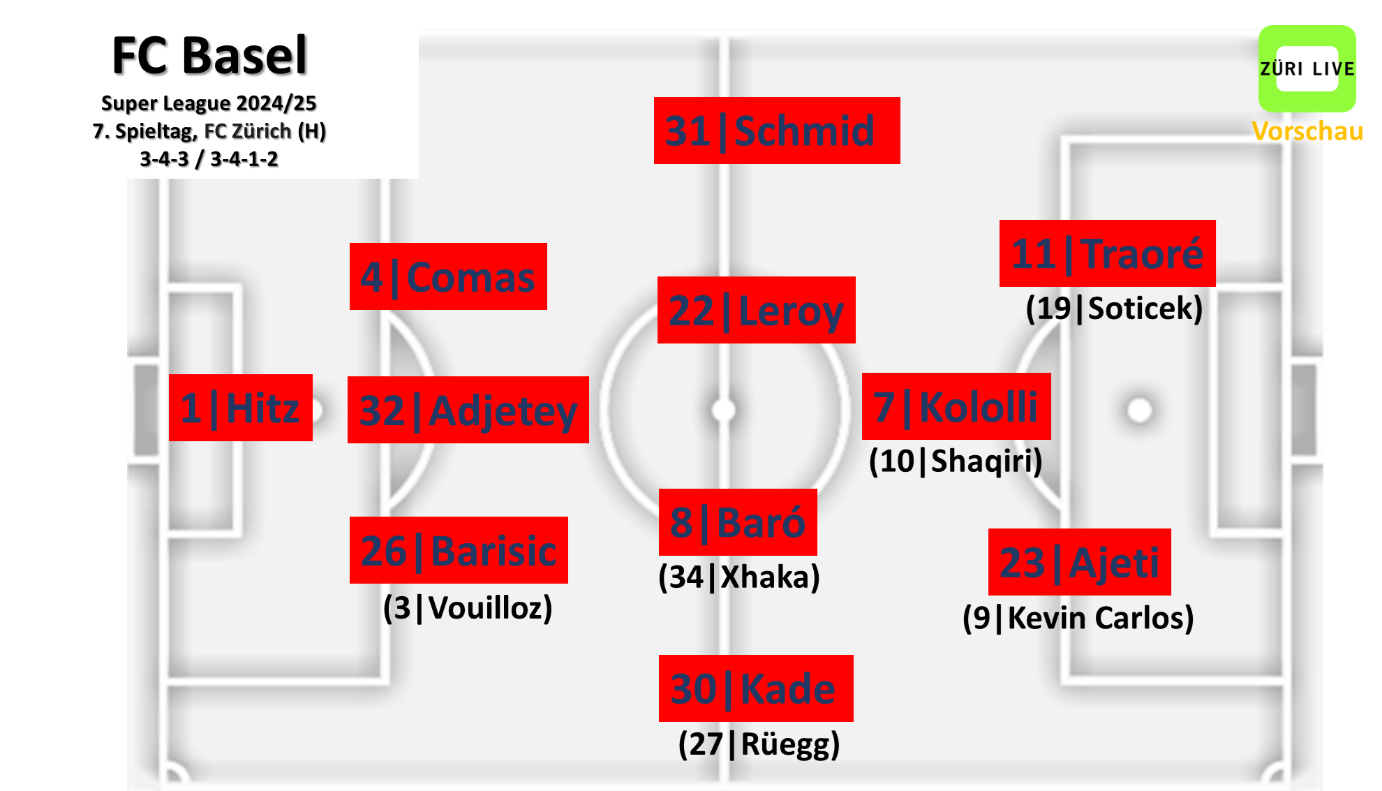Für den FC Zürich startet die Meisterschaft mit dem Siebtrundenspiel im St. Jakob Park in Basel ein zweites Mal – und dies eine Woche nach dem 2:1-Sieg der FCZ Frauen auf dem gleichen Platz. Innert zwei Wochen trifft das Heerenschürli-Team auf vier Gegner aus den Top 7 der Tabelle: FCB, St. Gallen, Sion und Lugano. Eine veritable Herausforderung also für das einzige bisher in der Liga noch ungeschlagene Team. Der FC Basel hat nach vier Siegen ohne Gegentor in Folge zuletzt nach 90 Minuten in Sion und Nyon jeweils Unentschieden gespielt. Man trat dabei zuletzt jeweils mit einer Dreierabwehr an. Die beiden Aussenläufer Schmid und Kade staffeln häufig weit zurück und wollen dafür sorgen, dass man defensiv gut steht, was zuletzt auch sehr gut funktioniert hat. Gleichzeitig hat das Team von Coach Fabio Celestini in dieser Saison bisher am meisten Ligatore erzielt. Leon Avdullahu fehlt nach der zweiten Gelb-Roten Karten in Folge erneut gesperrt und wird durch Neuverpflichtung Baró (von Porto) oder Taulant Xhaka ersetzt. Vorne tritt der fCB entweder mit einem Dreimannsturm oder einem zurückhängenden 10er an. Letzteres ist aus personellen Gründen wahrscheinlicher.