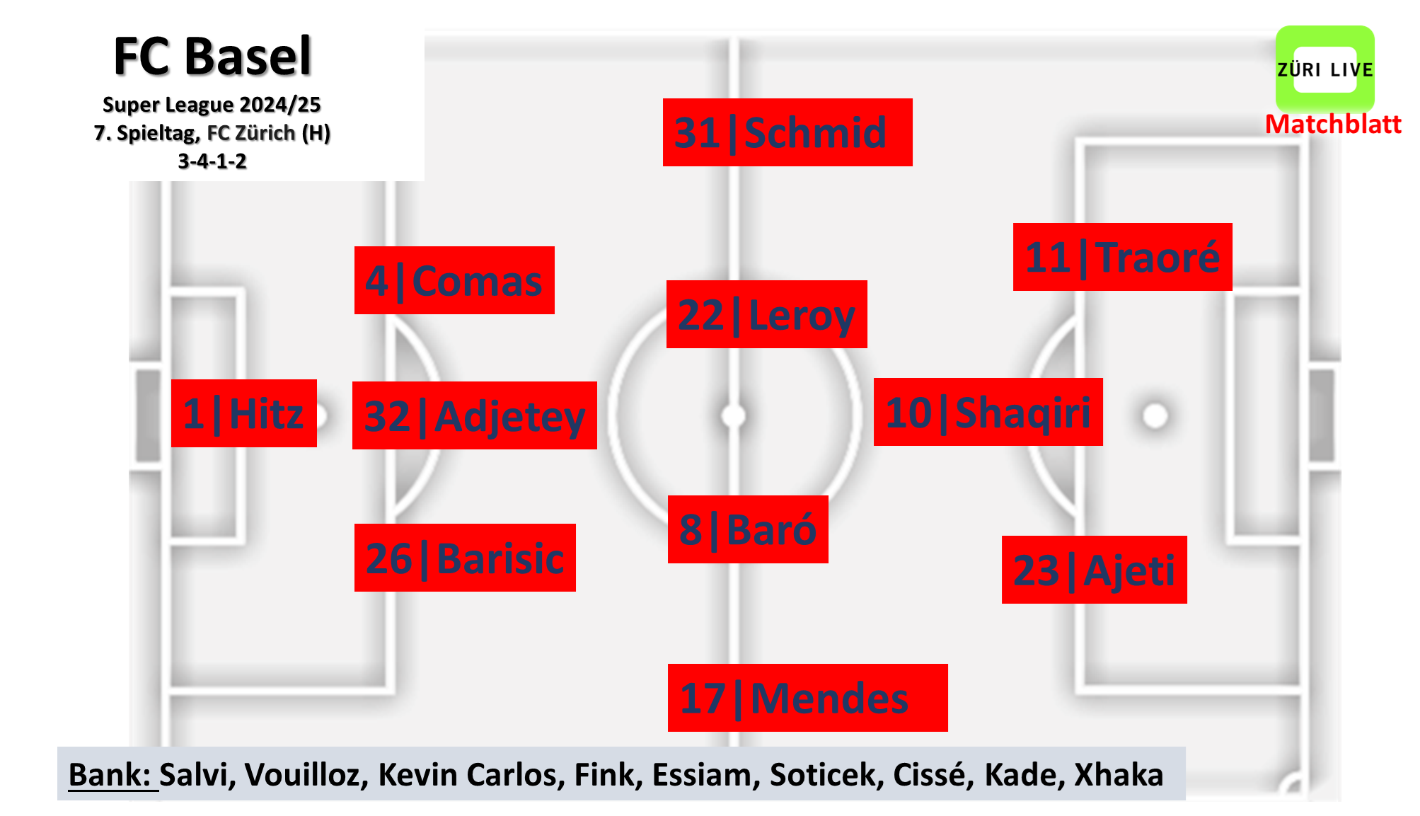 Das Matchblatt ist da! Wie erwartet wird der FCB im 3-4-1-2 auflaufen. Dies aber mit dem von Braga gekommenen Joe Mendes und Xherdan Shaqiri beide in der Liga erstmals in der Startformation.