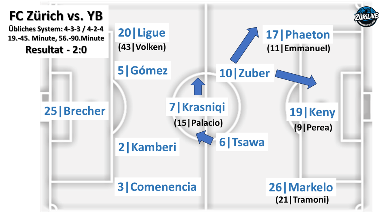 Äusserst erfreulich war hingegen die Leistung von Philippe Keny. Nicht nur wegen seinen zwei Toren. Der Senegalese war sehr engagiert und ist der beste Zielspieler für die hohen Bälle Yanick Brechers seit sehr langer Zeit und nimmt in dieser Hinsicht eine wichtige Rolle ein. Nicht zuletzt gelangen ihm mehrere Ballgewinne in der gegnerischen Platzhälfte, die zu gefährlichen Umschaltsituationen für den FCZ führten. Keny schlich sich dabei Berner Mittelfeldspielern jeweils von hinten an und trennte sie mit fairen Mitteln vom Ball. An der Vorbereitung beider Tore entscheidend beteiligt war Bledian Krasniqi (Kopfballablage und Einleitung des Angriffs). Tsawa schlug die Massflanke auf Krasniqi vor dem 1:1, Markelos Schuss vor dem 2:1 war so tückisch, dass ihn YB-Goalie Keller nur nach vorne abwehren konnte.