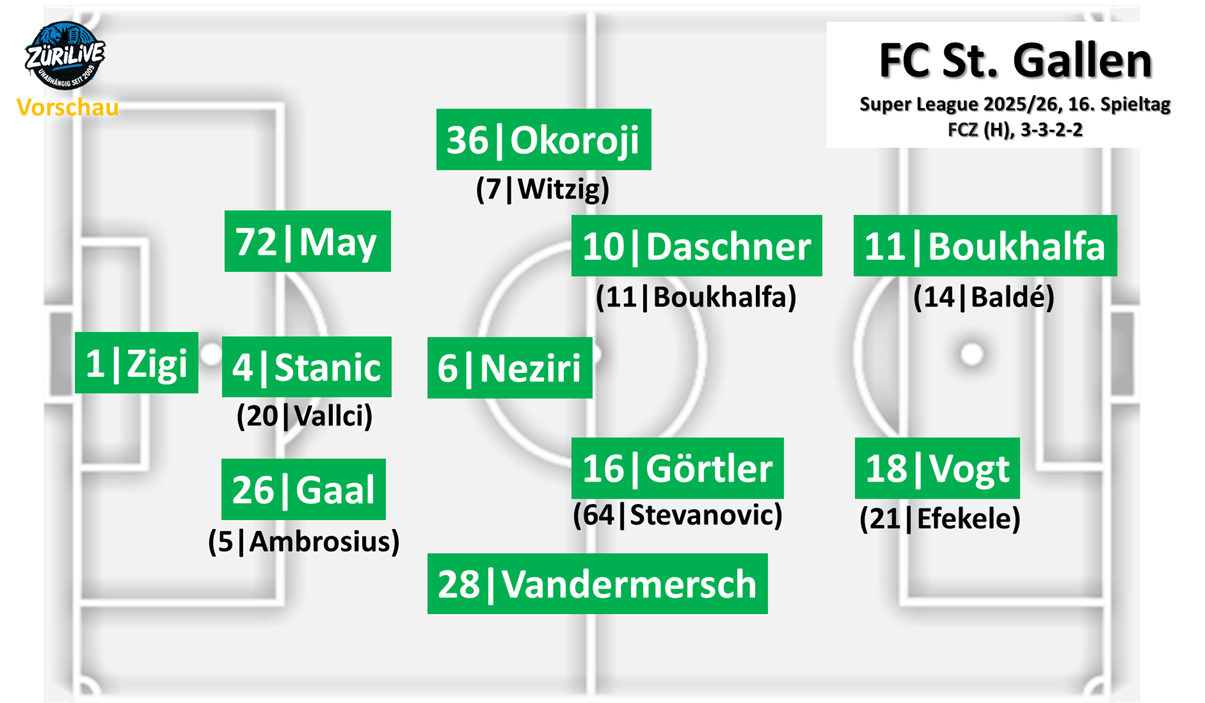 Der FC Zürich tritt nach dem Derbysieg ohne die gesperrten Markelo, Comenencia und Gomez sowie den verletzten Palacio an, In den letzten Partien hat Coach Dennis Hediger die taktische Formation fast auf jedes Spiel hin wieder gewechselt und auch während der Partie viel umgestellt. Ein Muster bleibt dabei aber die häufige Ausrichtung auf den Gegner. Hediger mag ein intensives Spiel mit vielen Zweikämpfen und passt daher die Formation häufig dem Gegner an. Gegen St. Gallen, das mit einem 3-3-2-2 antritt würde daher das 3-4-1-2 von der Partie gegen GC wieder gut passen und den Gegner “spiegeln“ (ein Zehner gegen einen Sechser, zwei Sechser gegen zwei Zehner).