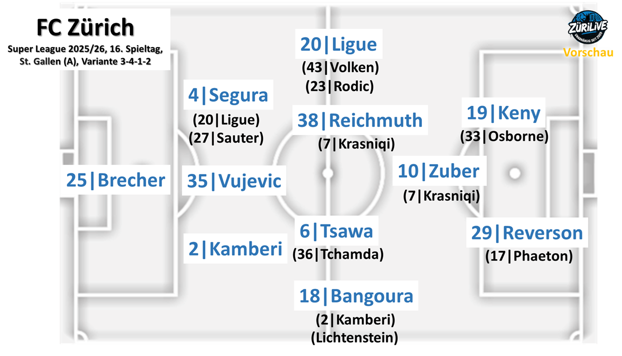 Der FC Zürich tritt in der 16. Runde der Saison 25/26 heute vielleicht zum letzten Mal im Kybunpark an – unter diesem Namen. Ab Sommer heisst die Arena neu Berit Sitterstadion und bis dahin ist aufgrund des “Schottenmodus“ nicht sicher, ob man nochmal im St. Gallen Winkeln antreten wird. St. Gallen gehört mit YB und GC zu den Mannschaften gegen die der FC Zürich in der Historie am meisten gewonnen hat – auch weil man meist in der gleichen Liga spielte. Im September konnte man damals noch unter Coach Mitchell Van der Gaag mit Assistent Dennis Hediger die Heimpartie nach einem Penalty-Gegentor in der 2. Halbzeit zu einem 3:1 drehen. Lindrit Kamberi kam dabei früh für Jorge Segura rein, der ausgerechnet heute aufgrund der Ausfälle wieder einmal zum Zug kommen könnte. Für Stürmer Philippe Keny seinerseits war das Heimspiel gegen St, Gallen der erste Startelfeinsatz in der Meisterschaft. Der Senegalese erzielte dabei gleich zwei Skorerpunkte.