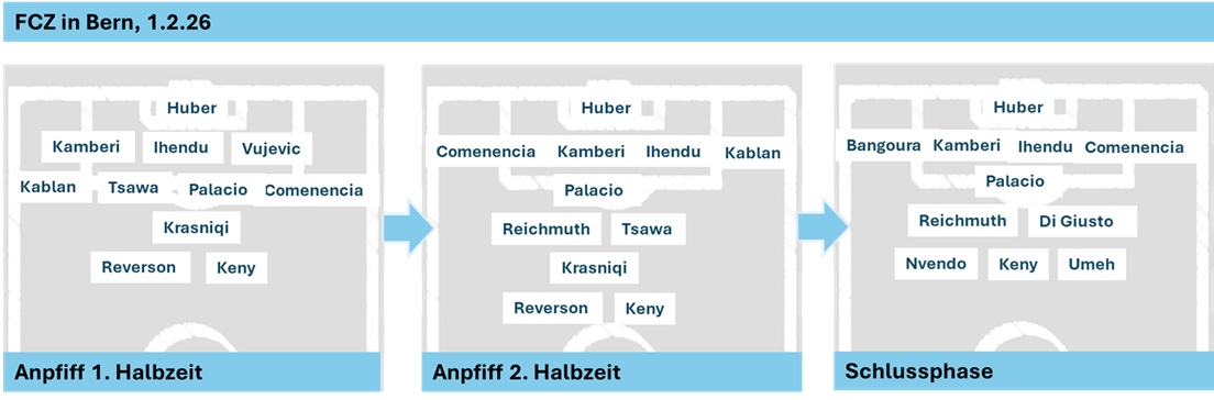 Cheveyo Tsawa (19) ist gesetzt. Einer der konstantesten Spieler beim FC Zürich mit grossen Offensiv- und Defensivqualitäten, schlägt die meisten Standards, und wenn er Verantwortung übernehmen kann, spielt er am besten. Diesen Frühling kann er beim FCZ mit guten Leistungen im Kampf gegen den Abstieg einen echten Impact erzielen. Als bestes Talent seit Ricardo Rodriguez wird der ziemlich sicher künftige Nationalspieler im Sommer wohl einen Wechsel zu einem Mittelfeld-Klub in einer Topliga vornehmen, möglicherweise gar oberes Mittelfeld. Miguel Reichmuth hatte seinen „Jour sans“ gegen Basel, kam in Bern zur Pause aber wieder verbessert zurück. Nelson Palacio ist nach seiner Innenbandverletzung, zugezogen bei einer heroischen Rettungsaktion im November in Sion, noch nicht in der Form des Herbstes. Weitere Optionen sind der zuletzt reifer gewordene Mohamed Bangoura und Aaron Tchamda. Eher nicht der Aufgabe gewachsen sind wohl zur Zeit Isaiah Okafor oder Cosimo Fiorini. Grundsätzlich können auch Krasniqi oder Stiel auf der Doppel-Sechs eingesetzt werden.