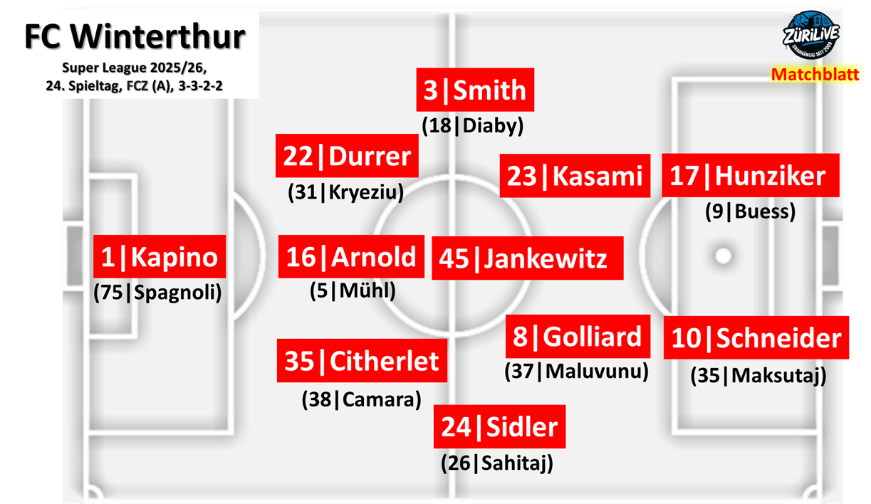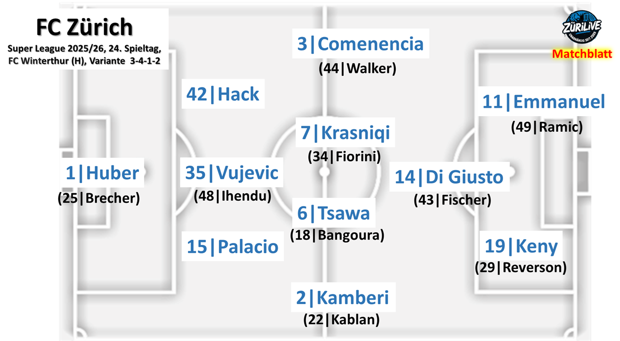 Zur Pause stellte Hediger mit dem Wechsel Reichmuth für Vujevic auf eine Viererabwehr und einen Mittelfeld-Rhombus um und dies erwies sich als richtige Massnahme. Die Verteidigung wurde stabiler und gleichzeitig das Mittelfeld dominanter. Es war die beste Phase des Zürcher Spiels. Die Wechsel Umeh Emmanuel für Bledian Krasniqi in der 61. Minute und vor allem Nevio Di Giusto für Cheveyo Tsawa in der 72. Minute taten dem Zürcher Spiel dann aber nicht gut. Einerseits personell: es kamen zwei Spieler, die null (Umeh) oder fast keinen (Nevio) Einfluss aufs Spiel ausübten, für einen ordentlichen Krasniqi und einen dominanten Tsawa. Hediger scheint mehr oder weniger die gleichen Wechsel zum jeweils gleichen Zeitpunkt vorzunehmen – unabhängig davon ob diese Wechsel im konkreten Spiel Sinn machen oder nicht. Ausserdem agierte man ab der 61. Minute in einer äusserst seltsamen Variante eines 4-3-3 in welchem die Aussenstürmer auf den Halbpositionen agieren. Die Raumaufteilung stimmte nicht.