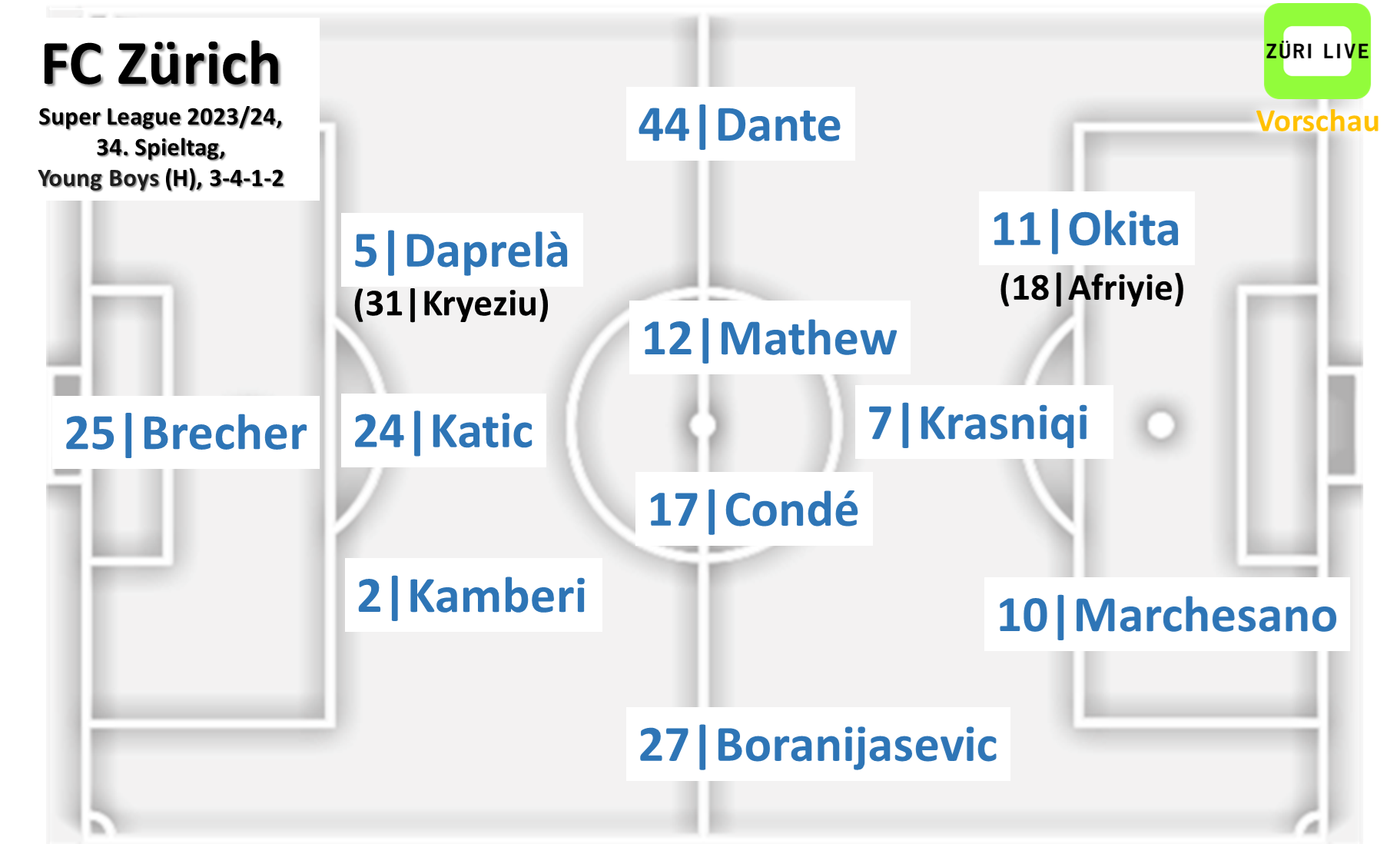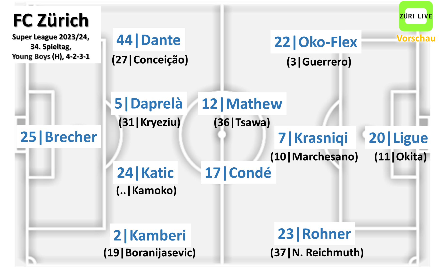 Beim FCZ sieht es nach einem 3-4-1-2 aus, in welchem Rohner und Conceicão für Boranijasevic und Dante eine Chance in der Startformation erhalten. Nevio Di Giusto ist trotz 63 Minuten-Einsatz gestern in der Promotion League genauso auf der Ersatzbank dabei wie Cheveyo Tsawa (neben Vater und Assistenztrainer Dorjee) oder Nils Reichmuth: